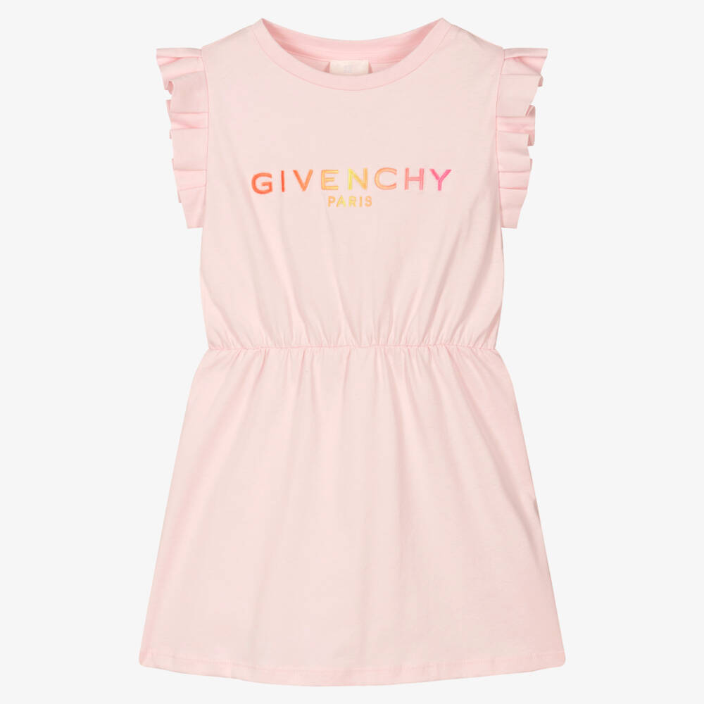 Pale pink cotton dress for girls by luxury French brand Givenchy, made in soft and stretchy lightweight cotton jersey. It has a colourful embroidered logo on the front and a matching 4G logo embroidered on the back. This causal dress has a comfortable elasticated waist and pleated frill trims on the armholes.