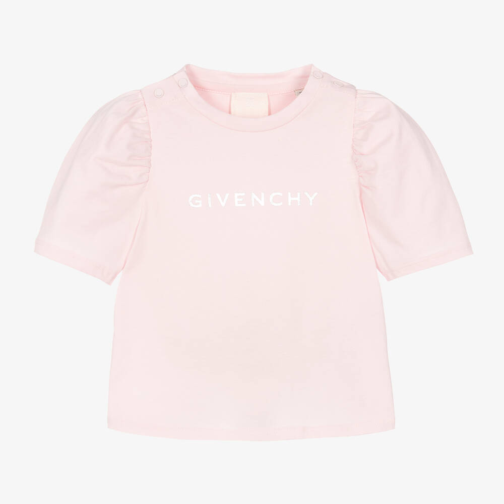 Light pink T-shirt for little girls by luxury French brand Givenchy, made in soft cotton jersey for comfort and wearability. Printed with metallic silver lettering, this casual design has a round neckline and short puff sleeves. Tonal poppers on one shoulder make dressing easier. The iconic 4G logo can be seen on the back of the hem for extra designer appeal.