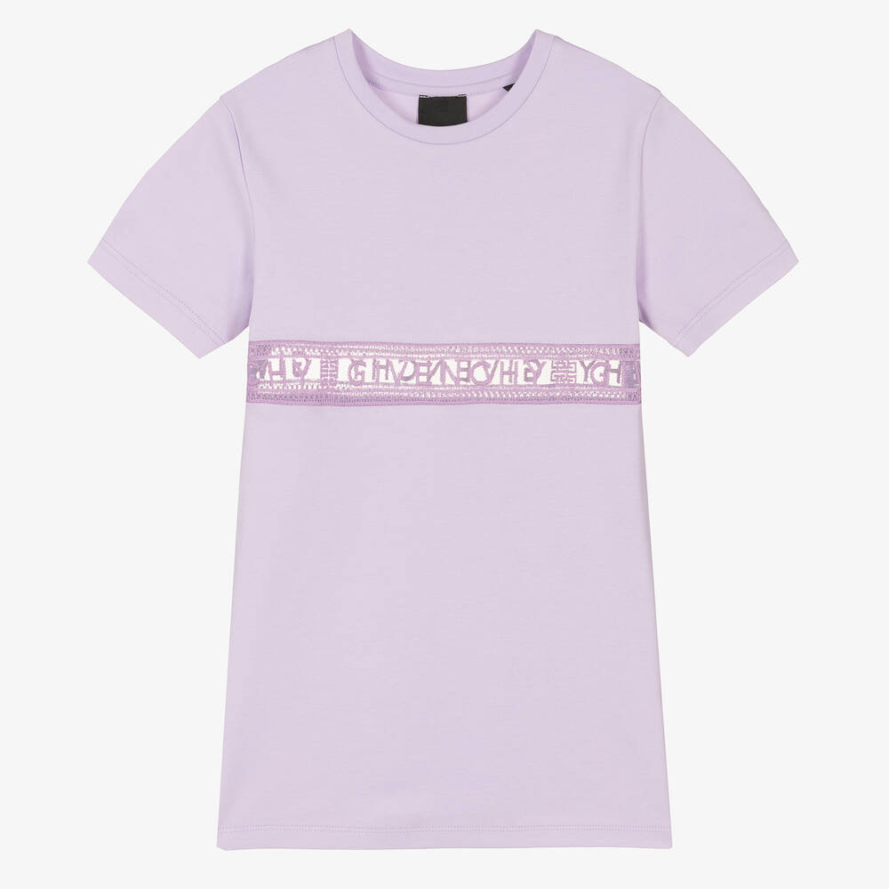 Lilac purple cotton T-shirt dress for girls by French designer Givenchy, made in soft, stretchy and lightweight jersey. There is a modern lace panel on the waist, embroidered with the label's branding and 4G logo for a luxurious finish.