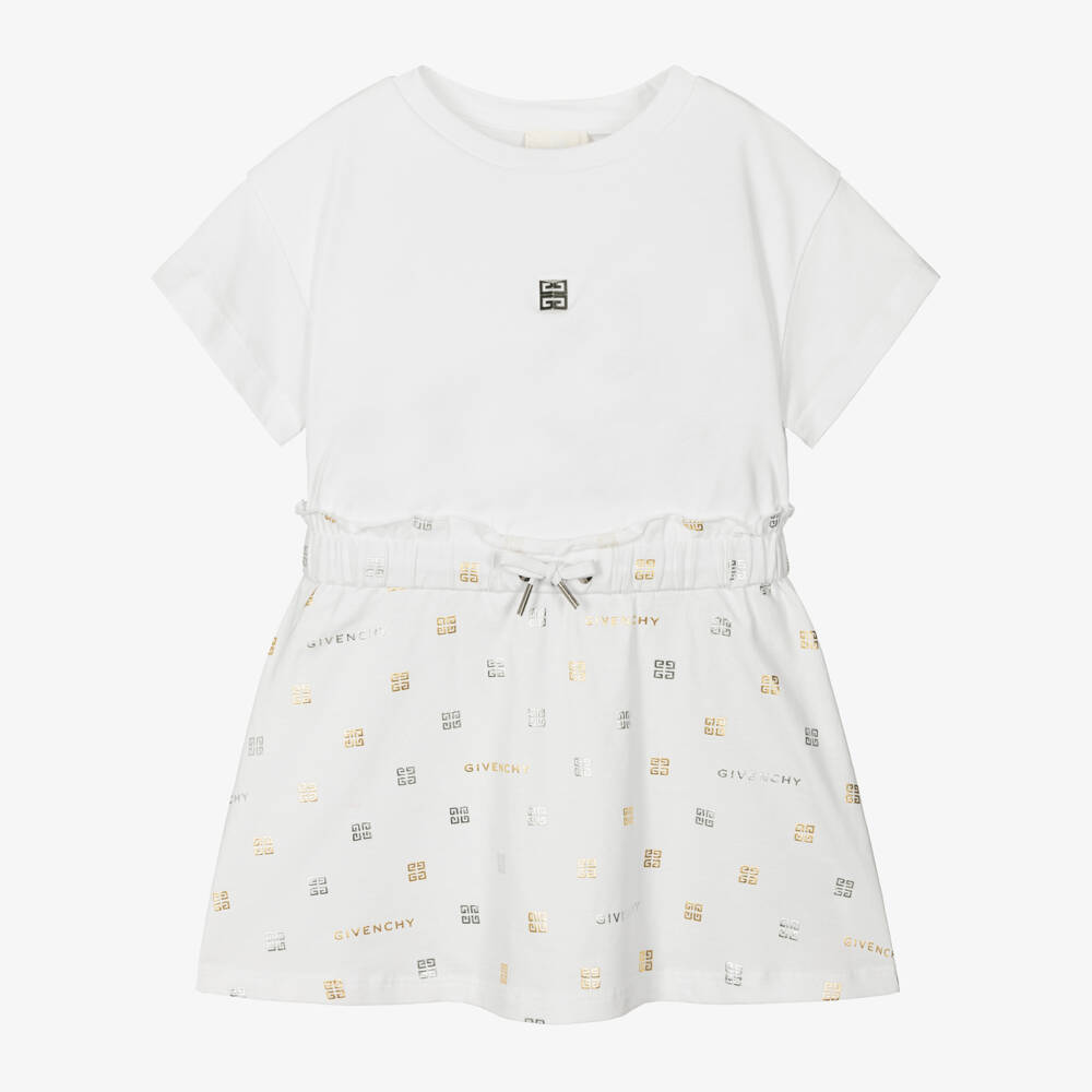 A modern white crew neck dress for girls by luxury designer Givenchy, made from soft cotton jersey. Featuring the signature 4G logo, this instantly recognisable style has a metal logo plaque with a metallic silver and gold design on the skirt. It has a paperbag waist with an adjustable drawstring fastening for added definition and shape.