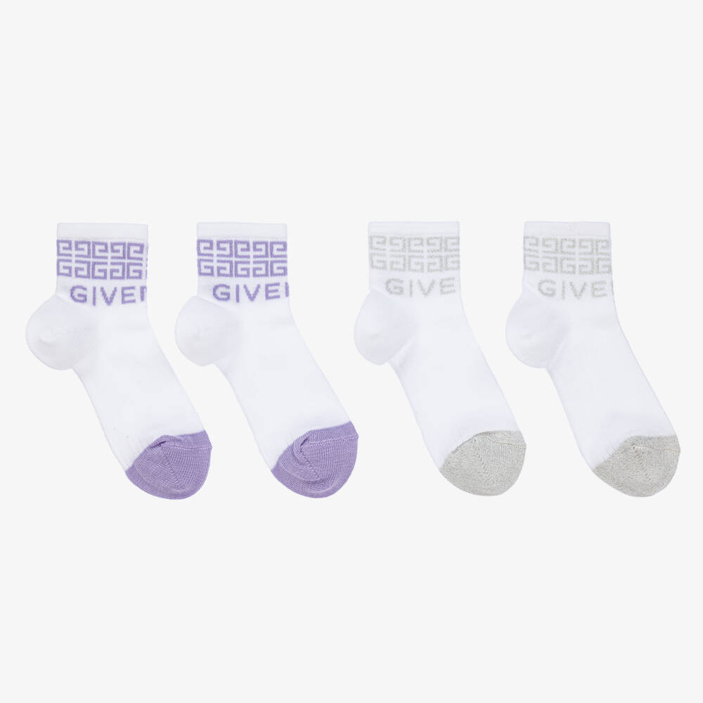 Two pairs of white ankle socks for girls by luxury French designer Givenchy, knitted in a super soft cotton blend. Designed to stand-out, both pairs feature the instantly recognisable 4G logo, in silver glitter and lilac purple.