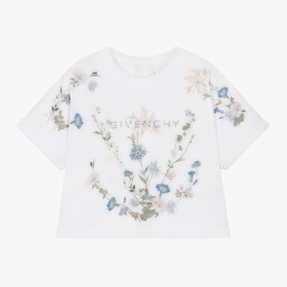White cropped T-shirt for girls by luxury brand Givenchy, made in soft cotton jersey. Inspired by the adult collection, this short-sleeved tee is patterned with pretty, blur-effect garden flowers in muted shades of blue, pink and green. Stamped with the designer's name, it has a boxy fit with a round neckline and turned-up cuffs.