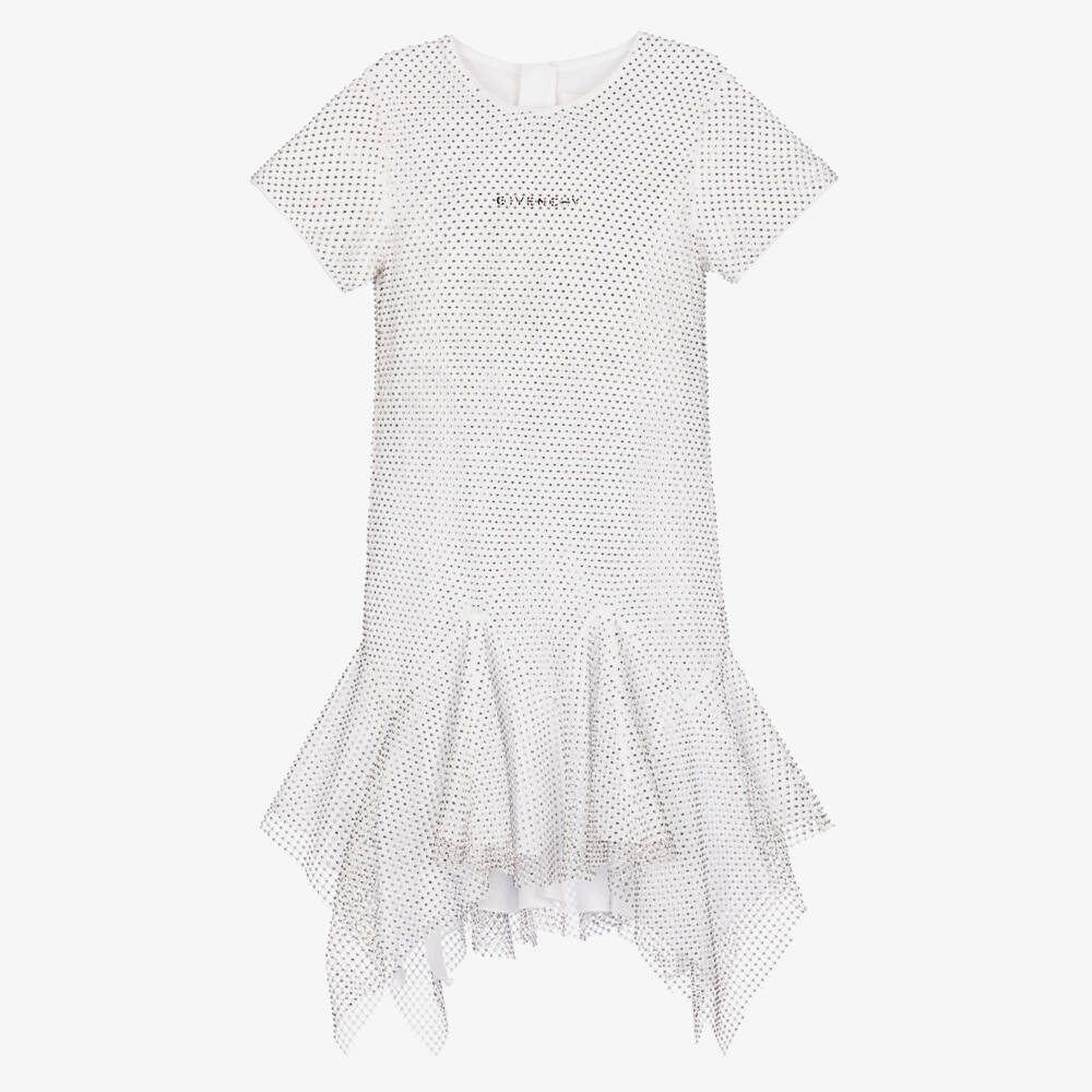 A stand-out look for girls, this white dress from luxury French label Givenchy, is made in lattice fabric, sparkling with silver studs. Simply designed with a round neck and short sleeves, it has a flounced hem for a stylish touch. The dress is comfortably lined in lightweight cotton and printed with a black logo on the chest, visible beneath the lattice layer.