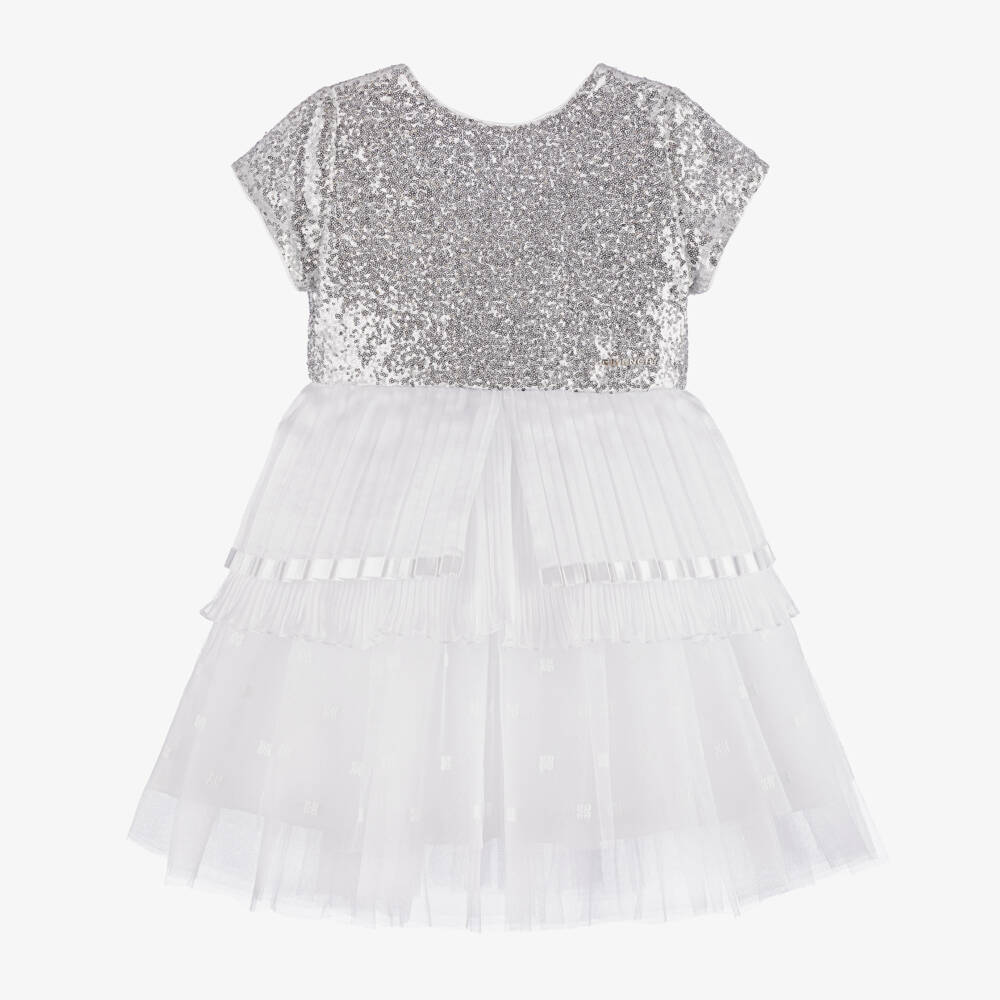 Gorgeous white tulle dress for girls by luxury brand Givenchy, with a silver sequin embellished bodice. The sparkly bodice has a silver metalwork logo above the waistline and the brand's iconic 4G logo is embroidered on one of the tulle layers of the skirt for a designer touch. It fastens with a branded exposed zip on the back for an alternative finish.