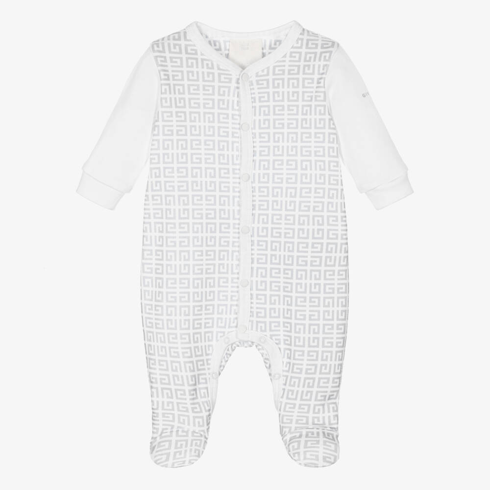 White and pale grey babygrow by Givenchy for boys and girls, printed with a signature 4G logo design. Fastening with poppers for easy dressing, this luxury babysuit is made in soft cotton jersey, ideal for babies delicate skin.