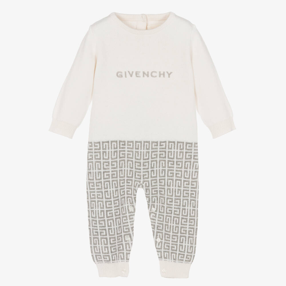 An ivory romper for baby boys and girls by luxury designer Givenchy, knitted in the finest cotton and cashmere blend. It has a grey logo embroidered on the chest, with an iconic 4G logo design for an eye-catching look. There are pearlescent button fastenings on the back and between the legs.