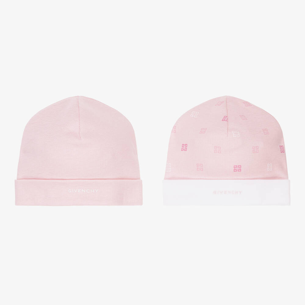 Pack of two pink hats for baby girls by luxury French brand Givenchy. For instant designer appeal, the plain pink hat has a white logo print on the turned-up brim and the other hat is patterned with 4G logos and has a pink spell-out logo on the white turned-up brim. Made in a double layer of soft cotton jersey, the hats will keep baby's head cosy and comfortable.