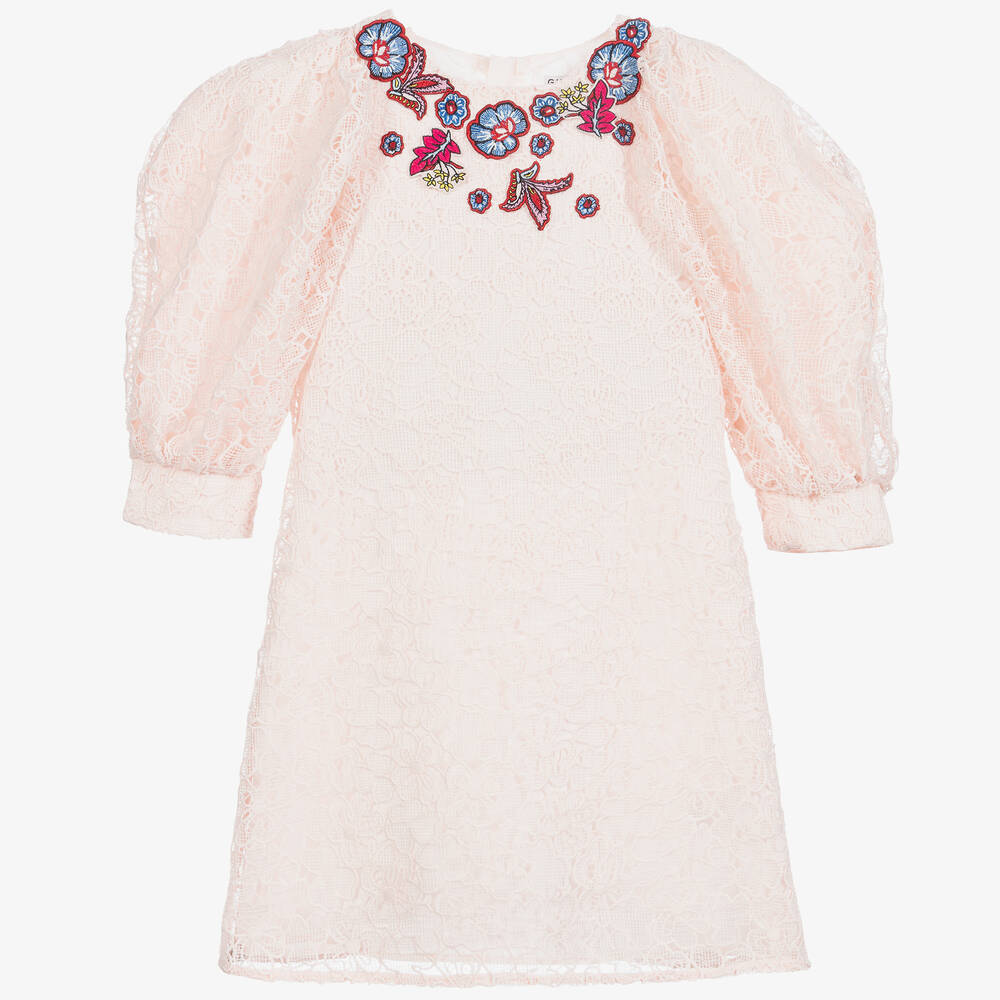 Inspired by the adult collection, a pretty pink dress for girls by luxury brand Givenchy Kids, made in delicate floral lace. It has puffed sleeves and embroidered badges on the neckline in pink, blue and yellow. Comfortably lined in lightweight cotton, the dress fastens with a concealed zip on the back.