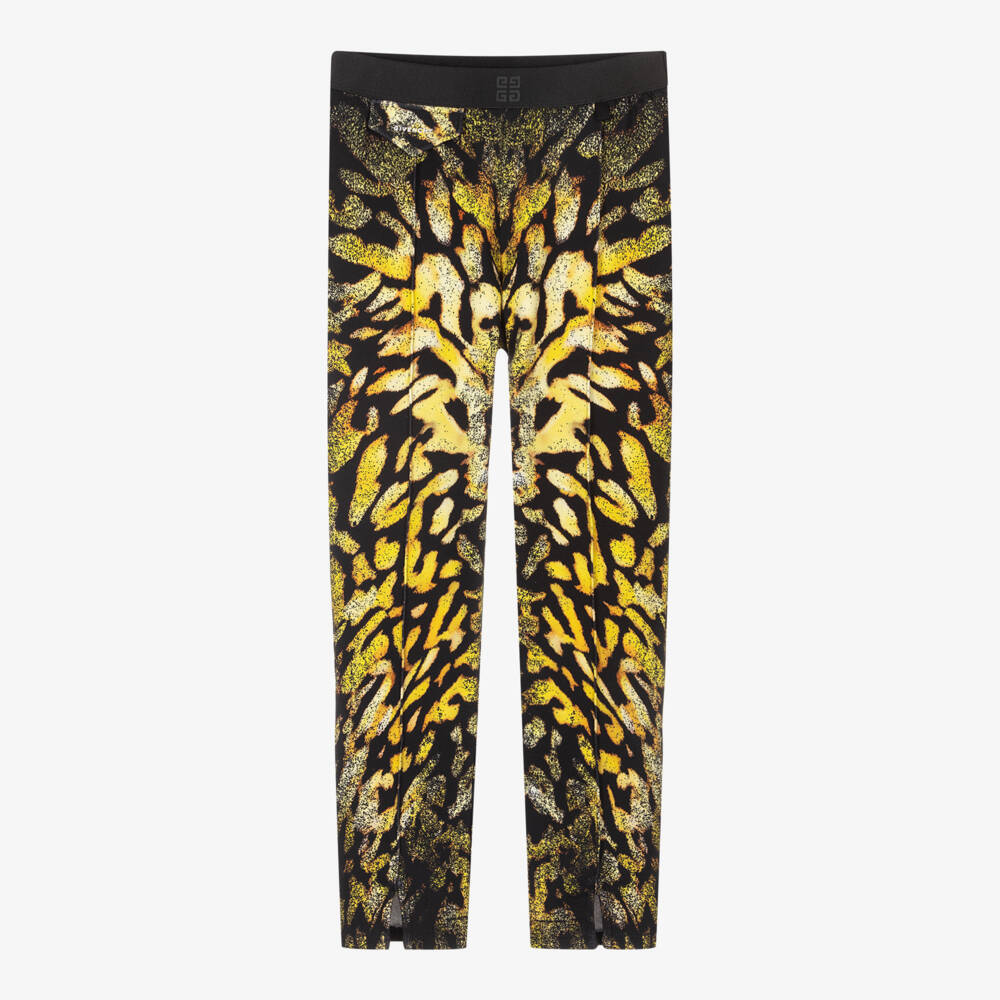 Teen girls black trousers with a yellow animal print by Givenchy Kids, from the Matthew M. Williams capsule collection. They have an elasticated waistband with a 4G logo on the front and logo lettering on the back. There faux pocket flap with white logo print on the front and the ankle cuffs have split hem detail. They are made in luxurious jersey.