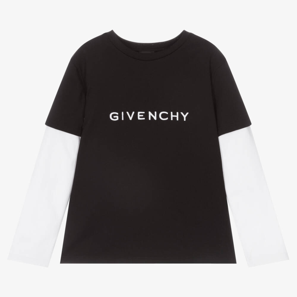 Black cotton top for teen boys by luxury designer Givenchy, as seen in the main collection. Designed to appear as a T-shirt with a long-sleeved top underneath, there are white sleeves attached to this stretchy jersey top. It has 4G logo bandana prints on the back panel and embroidered branding on the front.