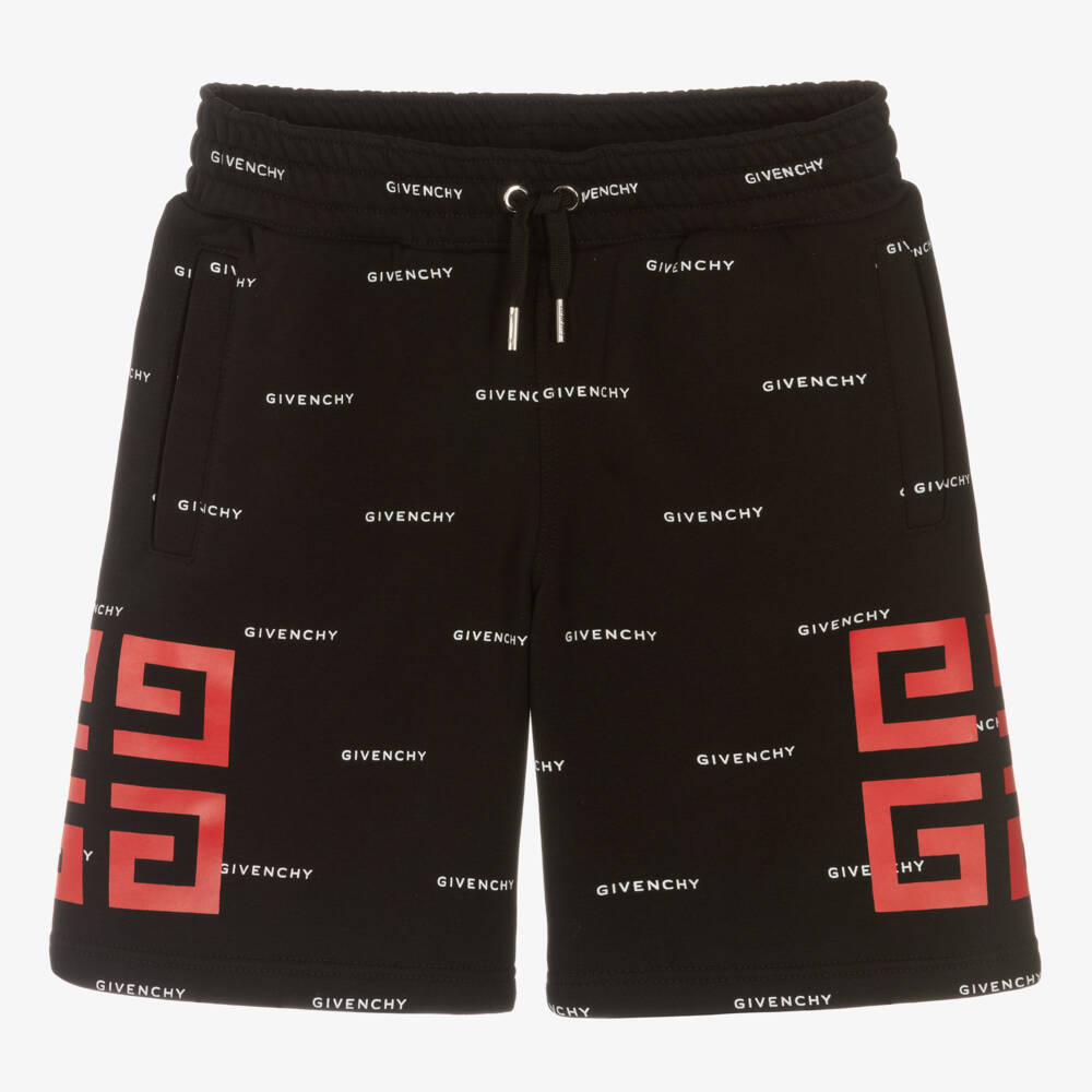 Casual black shorts for teen boys by luxury designer, Givenchy. Stamped with instantly recognisable logos, they combine bold, branded styling with comfort. The signature 4G logo is printed on each leg in red, adding a stand-out pop of colour to this lounging look. For a relaxed fit, they are made in soft cotton jersey and have a stretchy, drawstring waist and practical front pockets.