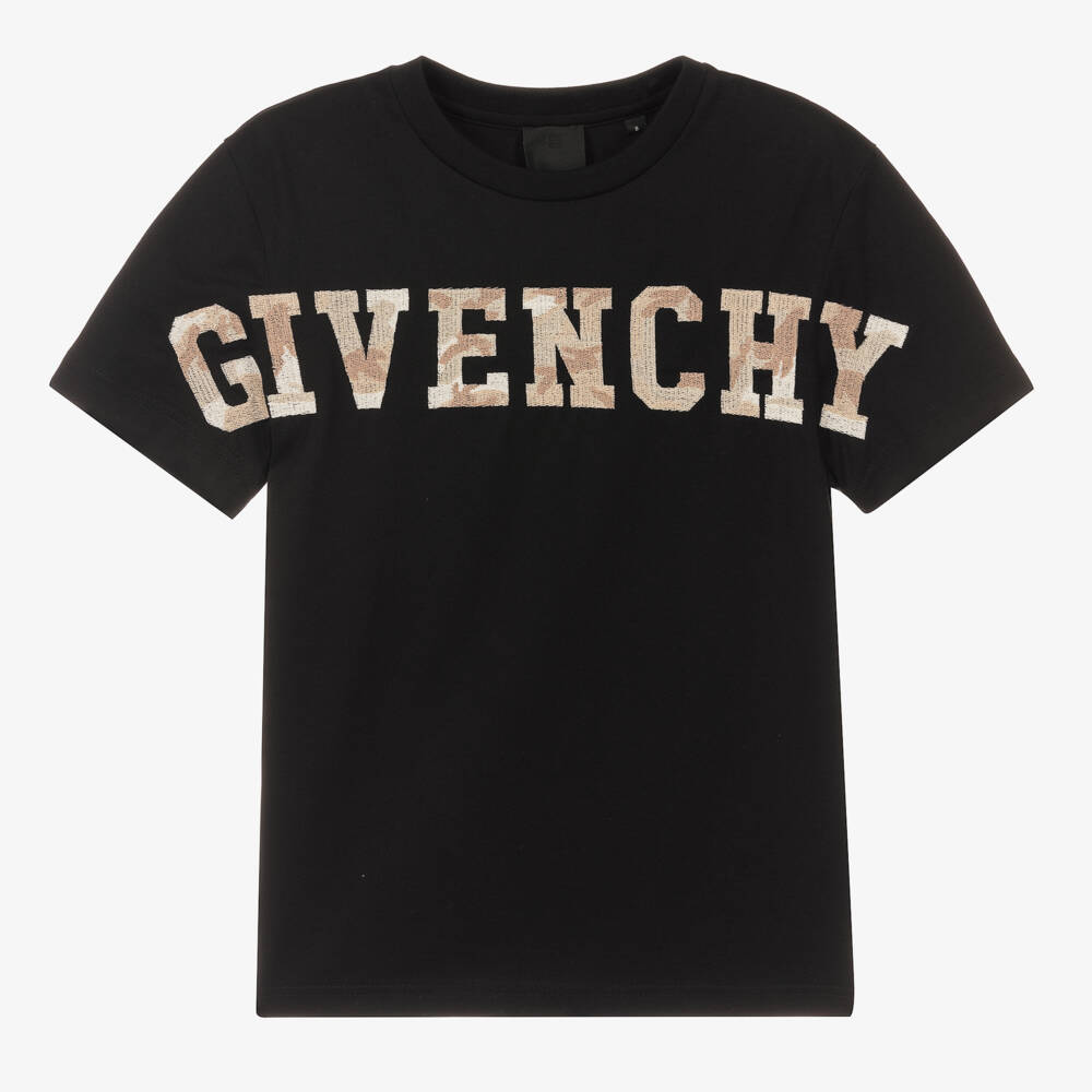 From Givenchy, a stylish black T-shirt for teen boys with the luxury brand's embroidered logo in a beige camouflage design. A classic style with a crew neck, it is made in comfortable cotton jersey.