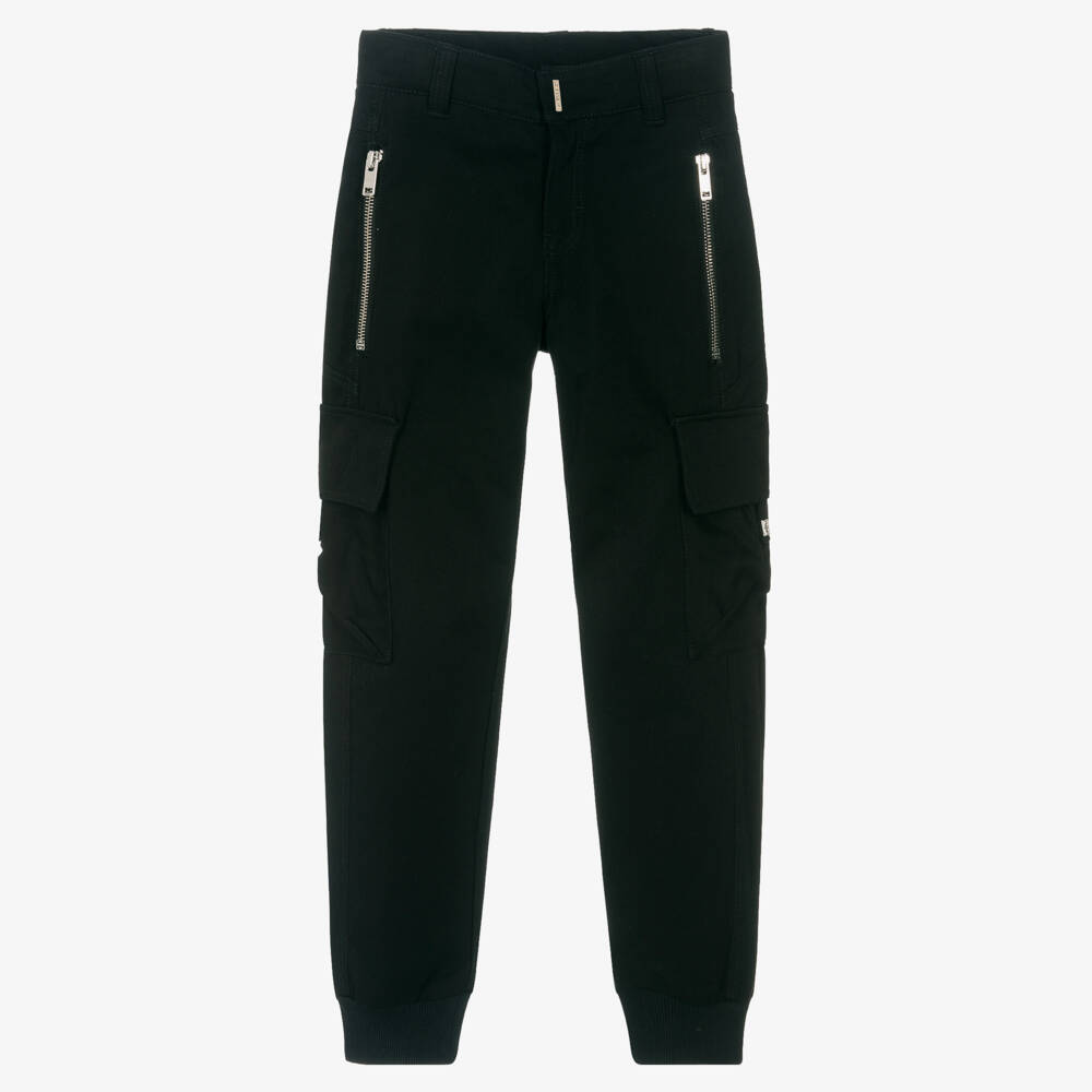 Stylish and functional black trousers for teen boys by luxury French brand Givenchy, made in durable cotton gabardine. Cargo-style with cuffed ankles, they have useful zipped pockets on the front, popper-fastening leg pockets and jetted pockets on the back. Branded silver metal hardware details add a discreet designer finish, together with a black leather logo-embossed jacron on the back waist.