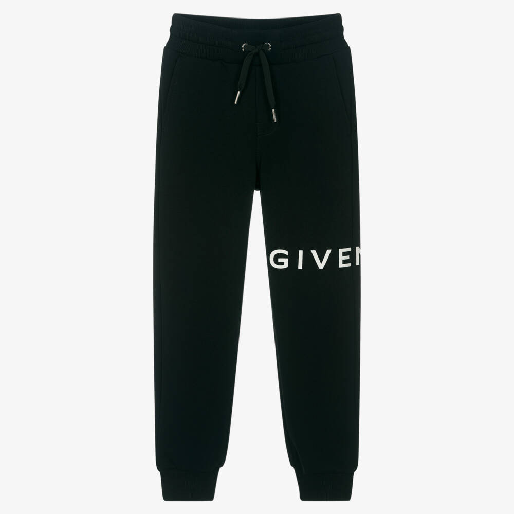 Casual style from luxury French brand Givenchy, with these comfortable black joggers for teen boys. As seen in the main collection, they have a large white logo print on one leg and a 4G logo on the back. They are made in soft mid-weight cotton jersey and have useful pockets on the front and back. The elasticated ribbed waistband has an adjustable drawstring tie with branded metal end caps to complete the look.