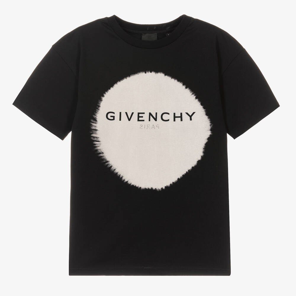 Classic black T-shirt for teen boys by luxury French brand Givenchy, made in comfortable cotton jersey. As seen in the main collection, it has an eye-catching white tie-dye effect print on the front and back, with the Givenchy Reverse logo.