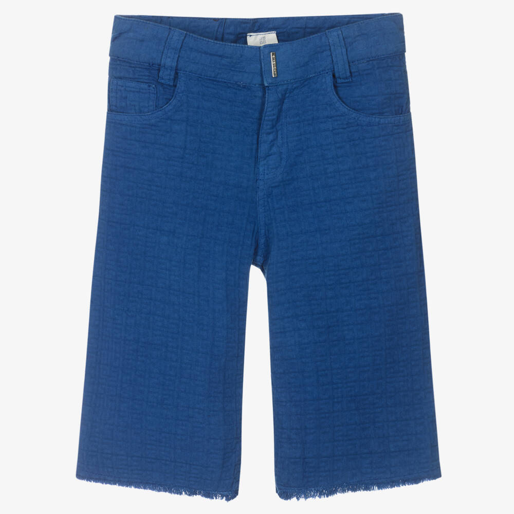 Royal blue cotton shorts for teen boys by French label Givenchy, inspired by the menswear collection. Crafted in lightweight twill, the luxury brand's 4G jacquard logo is intricately woven within the soft fabric for a distinctive designer look. A silver metal logo plate can be seen on the front, with 4G rivet detailing and a black embossed leather logo patch around the back. With five useful pockets, these comfortable shorts have fringe detailing on the hem for a touch of urban style.