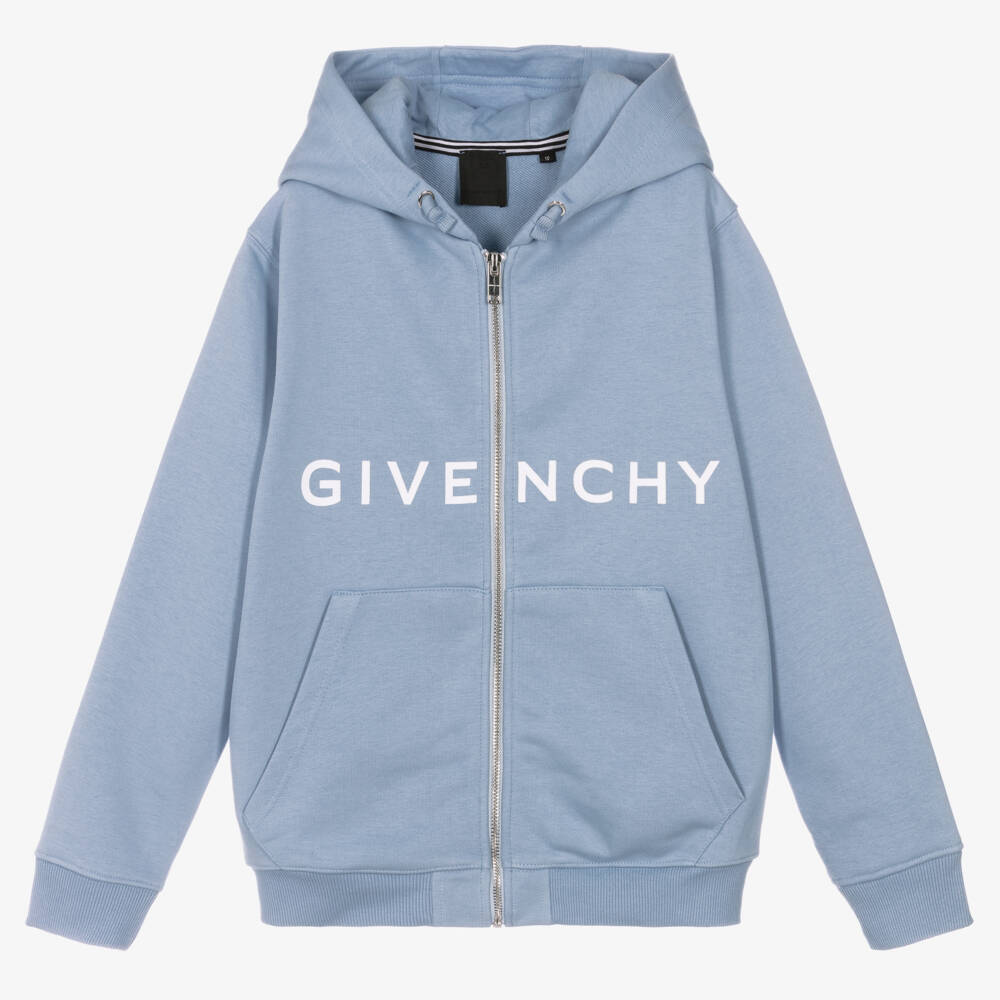 Understated blue zip-up hoodie for teen boys from French luxury brand Givenchy, as seen in the main collection. The distinctive centre piece of this top is the white logo lettering on the front and iconic 4G on the back, offering a lovely coordinated look. Made in mid-weight cotton jersey, it fastens with a subtle logo zip and has faux drawstring details on the hood.