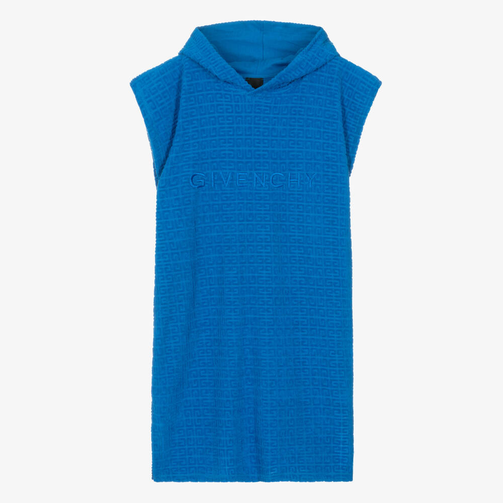 Vibrant blue hooded beach cover-up for teen boys by luxury French designer Givenchy, inspired by the main collection. Forming part of the Beach Club Capsule, this comfortable cotton towelling jersey poncho is patterned with the iconic 4G motif and embroidered with a spell-out logo for a distinctive look. Ideal for practical and stylish beach or poolside wear, it has concealed side seam pockets, a split hem and a soft jersey lining inside the hood.