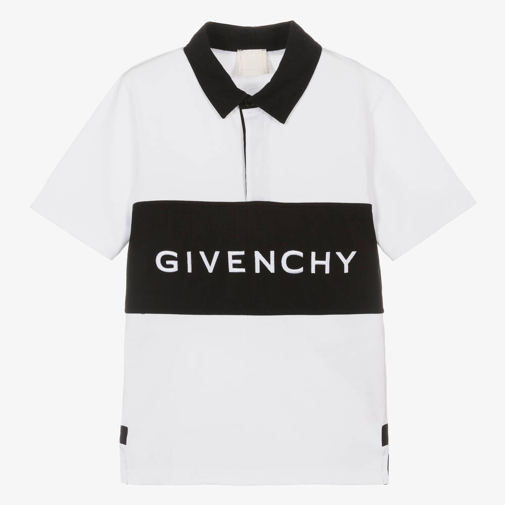 A white and black cotton short-sleeved rugby shirt for teen boys from Givenchy, as seen in the adult collection. With classic rugby shirt styling, this sports-luxe top is designed with a pointed twill collar and button fastenings under the placket. Made in heavier-weight jersey for a cool, structured drape, it has stand-out logo embroidery across the front and short-sleeves. The vented sides are enhanced by inner logo tape, adding a subtle designer touch.