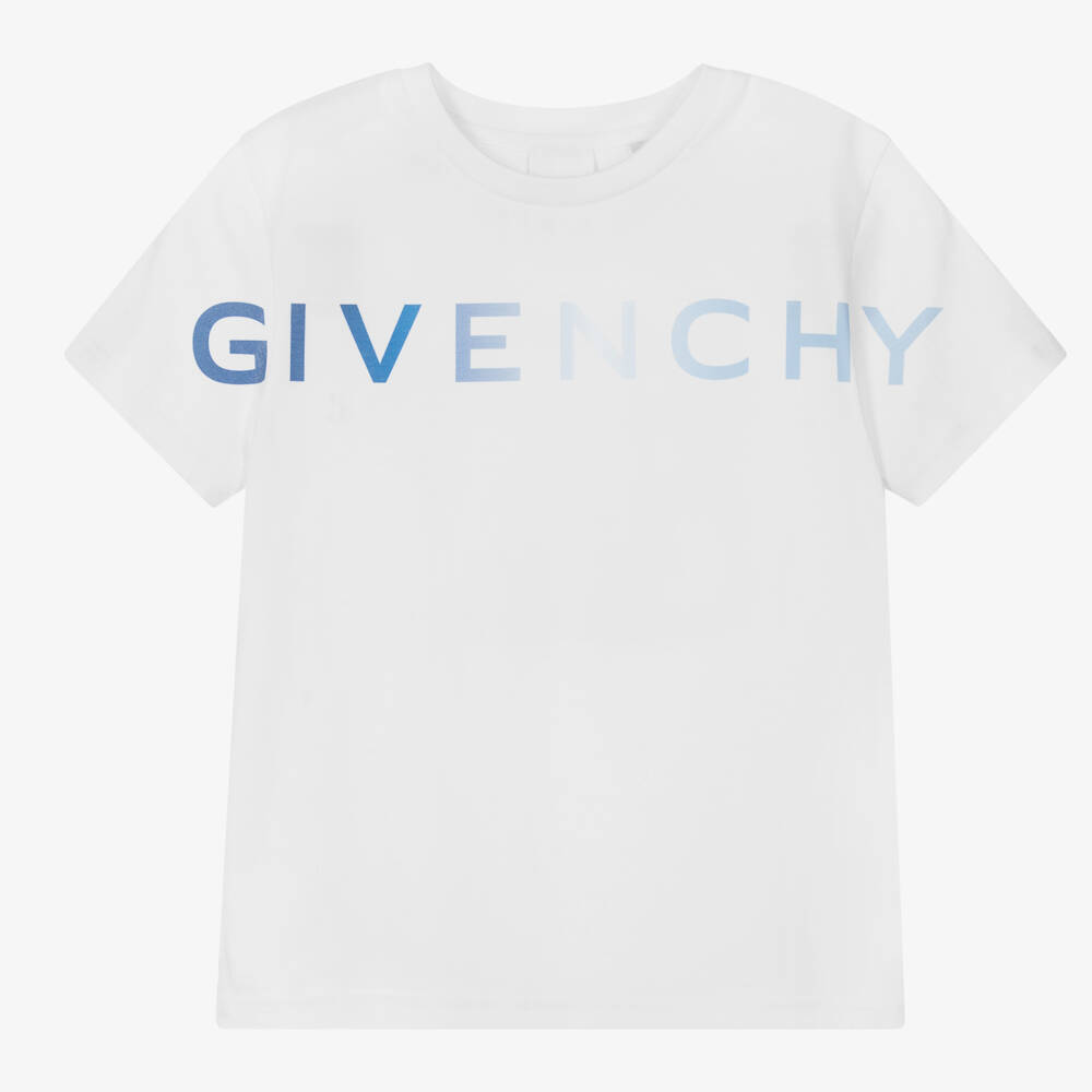 Classic white T-shirt for teen boys by luxury French brand Givenchy, as seen in the main collection. It has an ombre logo print across the front in shades of blue, with a matching 4G Peace emblem printed on the back. It is made in soft cotton jersey for comfortable wear.