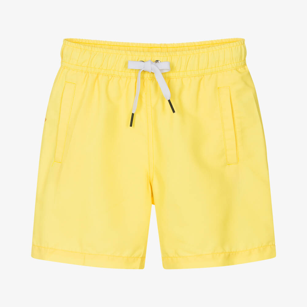 These yellow swim shorts from luxury brand Givenchy are for teen boys. The label's paint-effect logo is stamped on the back in complementary dark orange and blue. Silky and smooth, they have an elasticated waist with a branded drawstring for added designer detail. A comfortable mesh lining, drainage eyelets and useful front pockets finish these cool shorts.