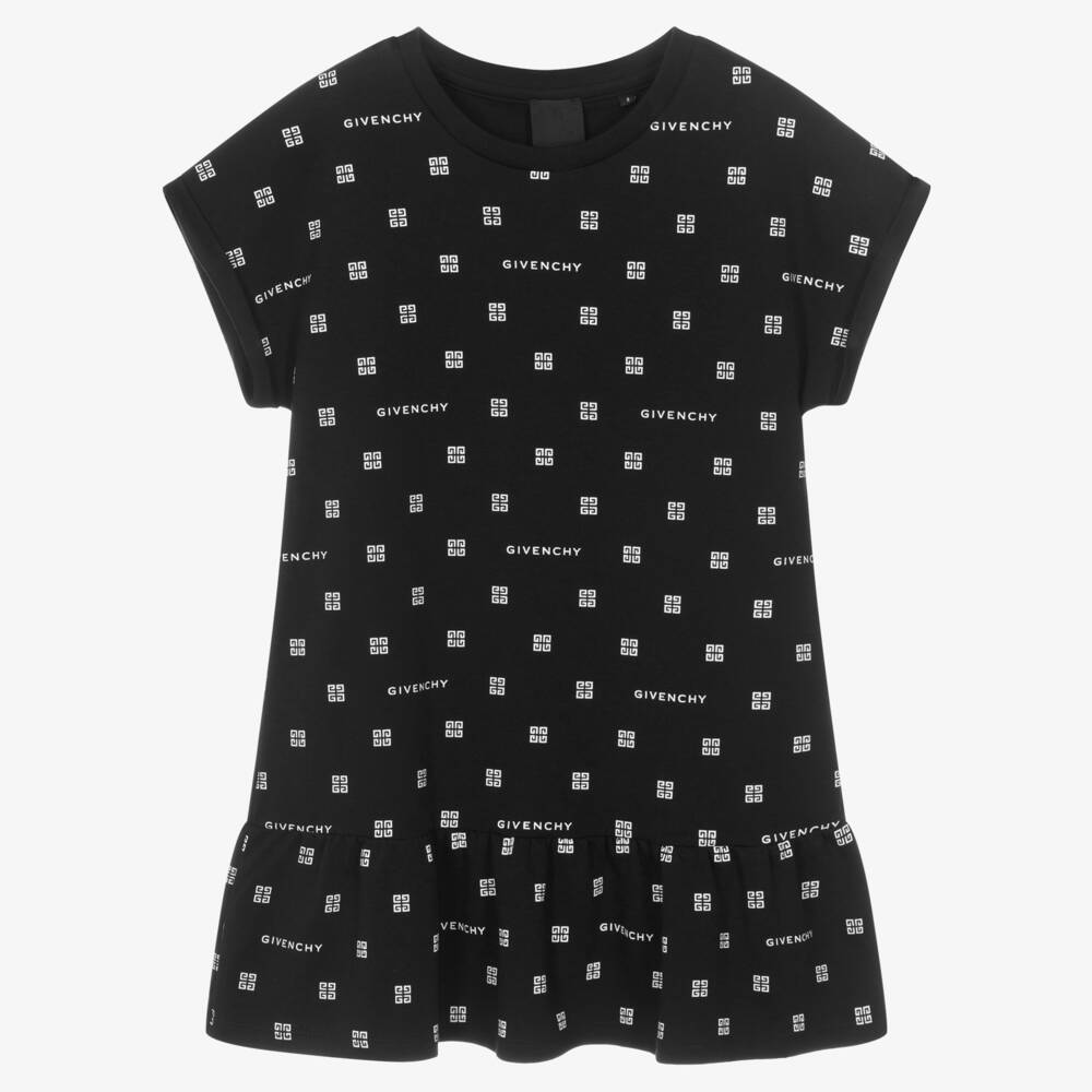 Designed by luxury label Givenchy, a black cotton T-shirt dress for teen girls. This comfortable and casual mini-length style is made in soft, stretchy and lightweight jersey, with the French designer's branding and 4G logo artwork in white. A ruffled hem and fixed turn-up sleeves complete this monochromatic look.