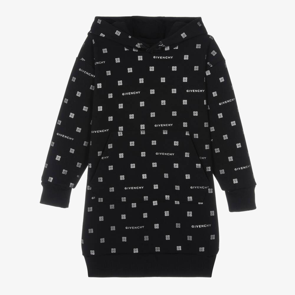 Black cotton hooded sweatshirt dress for teen girls by luxury French designer Givenchy. Instantly recognisable, it is patterned with shiny silver signature and 4G logos. Ideal for relaxed days with a designer touch, it is made in soft, comfortable jersey with neat, ribbed trims and a useful pouch pocket.