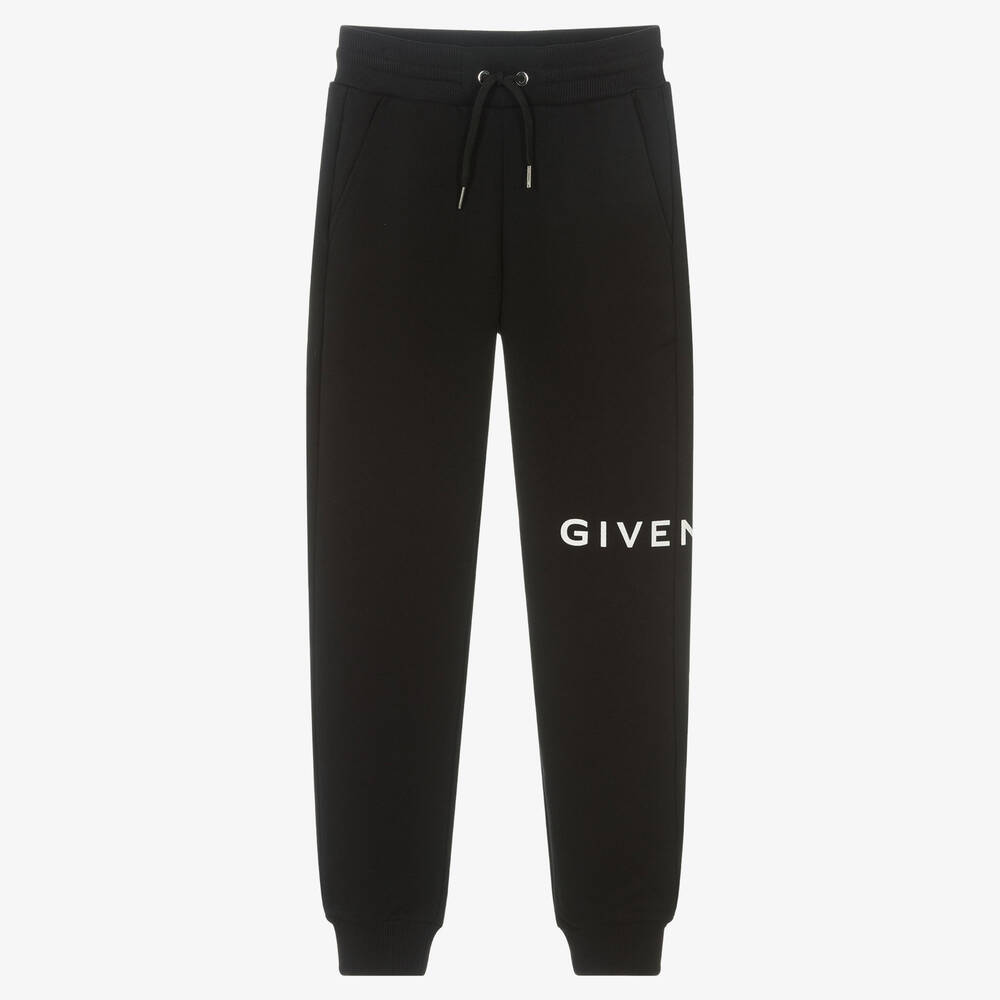 Teen girls black cotton joggers by French luxury brand Givenchy, as seen in the main collection. Instantly recognisable, they have a white wrap-around logo print on one leg and the iconic 4G logo on the back. Made in mid-weight jersey, there are handy pockets on the front and back, as well as an elasticated drawstring waist for a good fit.