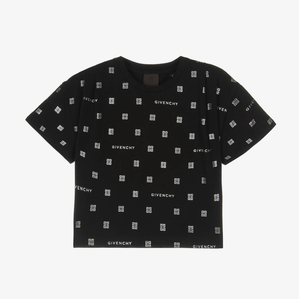 Black cotton T-shirt for teen girls by luxury French designer Givenchy. Instantly recognisable, it is patterned with shiny silver signature logos and 4G logos. Shorter in length with a boxy fit, the shoulders have little pleats on the front and back. Ideal for relaxed days with a designer touch, it is made in soft, comfortable jersey.