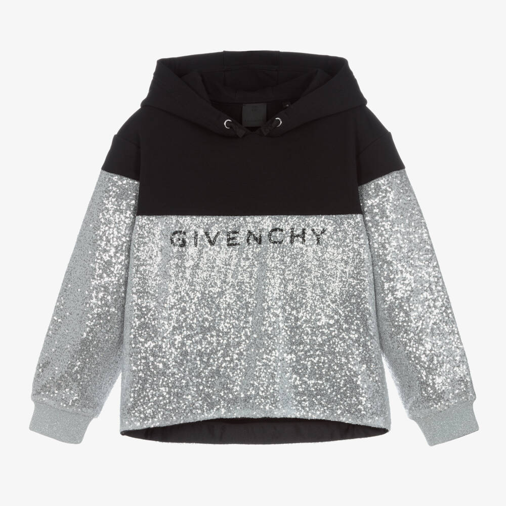 From luxury French brand Givenchy, a striking black and silver hooded sweatshirt for teen girls. Sparkling with sequins, it has a stand-out black logo across the front. This stylish hoodie is made in comfortable mid-weight cotton-blend jersey, with a dipped hem, glittery ribbed cuffs and faux drawstring details on the hood.