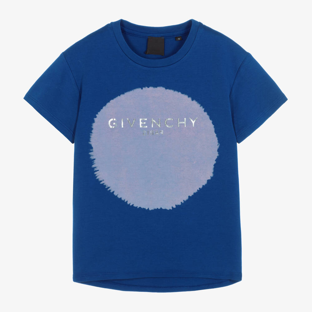 Blue Mini-me T-shirt for teen girls by luxury French brand Givenchy, styled with shiny silver foil Reverse logos. Made in soft and stretchy cotton jersey, this classic tee is designed with a circular colour-gradient motif on the front, with the same design appearing on the back. It has a classic crew neck and a dipped hem at the back for stylish simplicity.