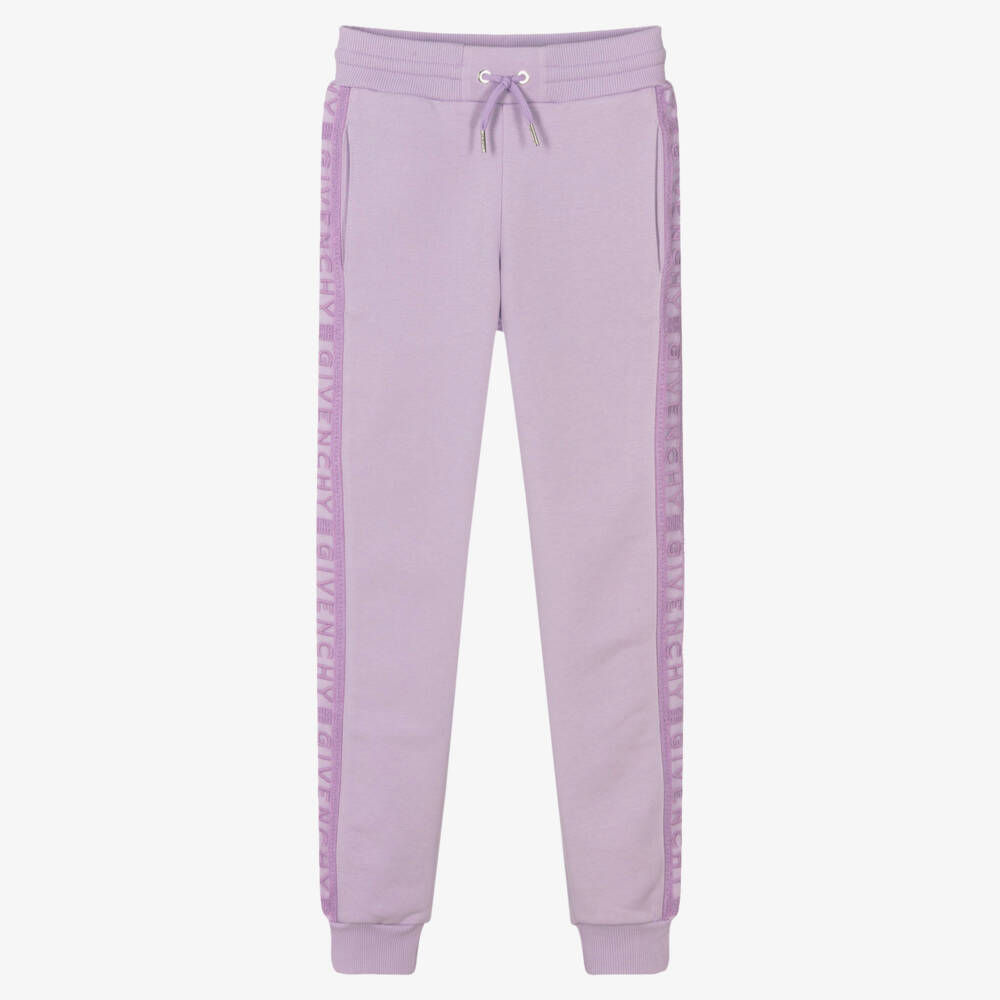 Lilac purple cotton joggers for teen girls by French designer Givenchy, as seen in the main collection. There are modern lace panels on the sides of the legs, embroidered with the label's branding and 4G logo for a luxurious finish. Made in soft and mid-weight jersey, they have three useful pockets and a comfortable drawstring waist.