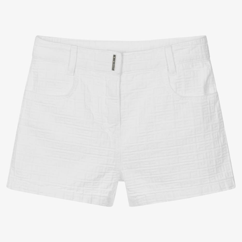 Teen girls white cotton shorts by luxury brand Givenchy. They are made in lightweight twill, with the label's 4G jacquard logo intricately woven within the soft fabric. Further designer elements include a silver metal logo plate on the front and 4G rivets around the back. Useful front and back pockets complete these smart-casual shorts.
