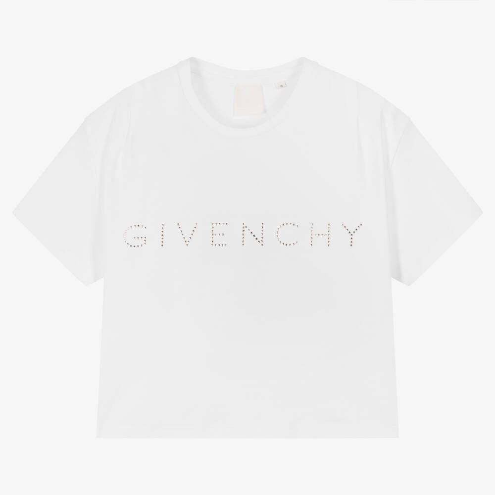 Add a touch of luxury to your casual wardrobe with this white cropped T-shirt for teen girls, by luxury designer Givenchy. Embellished with stunning Swarovski crystal's on the front spelling the brand's name, this cotton style has an edgy cropped fit combining contemporary, street style with feminine fashion.