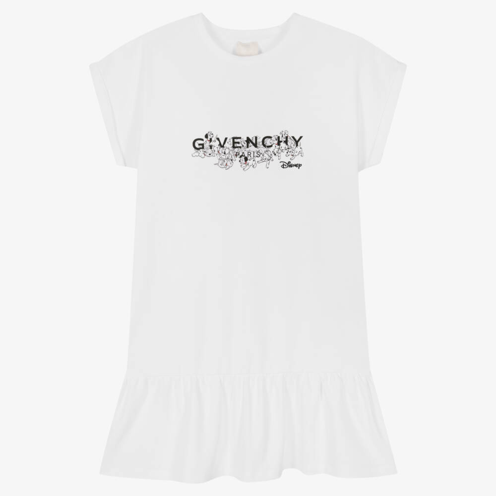 A white mini dress for teen girls from French brand Givenchy. Forming part of a collaboration with Disney, the luxury fashion house has designed this cool piece with 101 Dalmatians' puppies within a Givenchy Paris and 4G print on the front and back. Embroidered below are Disney logos. In a relaxed fit for comfort and a casual silhouette, it has a crew neckline, turn-up cuffs and a dropped ruffle hem.