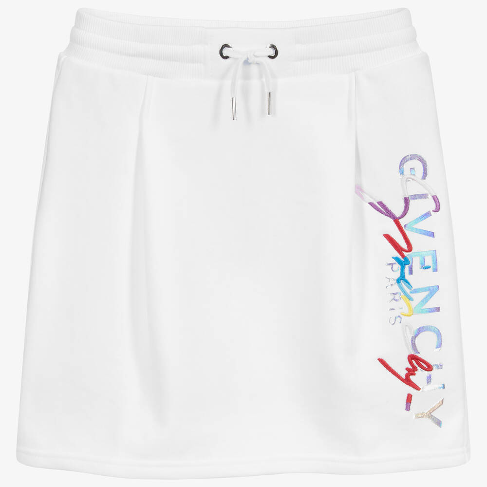 Teen girls white jersey mini skirt by luxury French brand Givenchy Kids, as seen in the main collection. Iridescent, colourful logo prints and embroidery are a joyful reflection of the designer's branding. The drawstring waistband adds to the comfortable, informal look.
