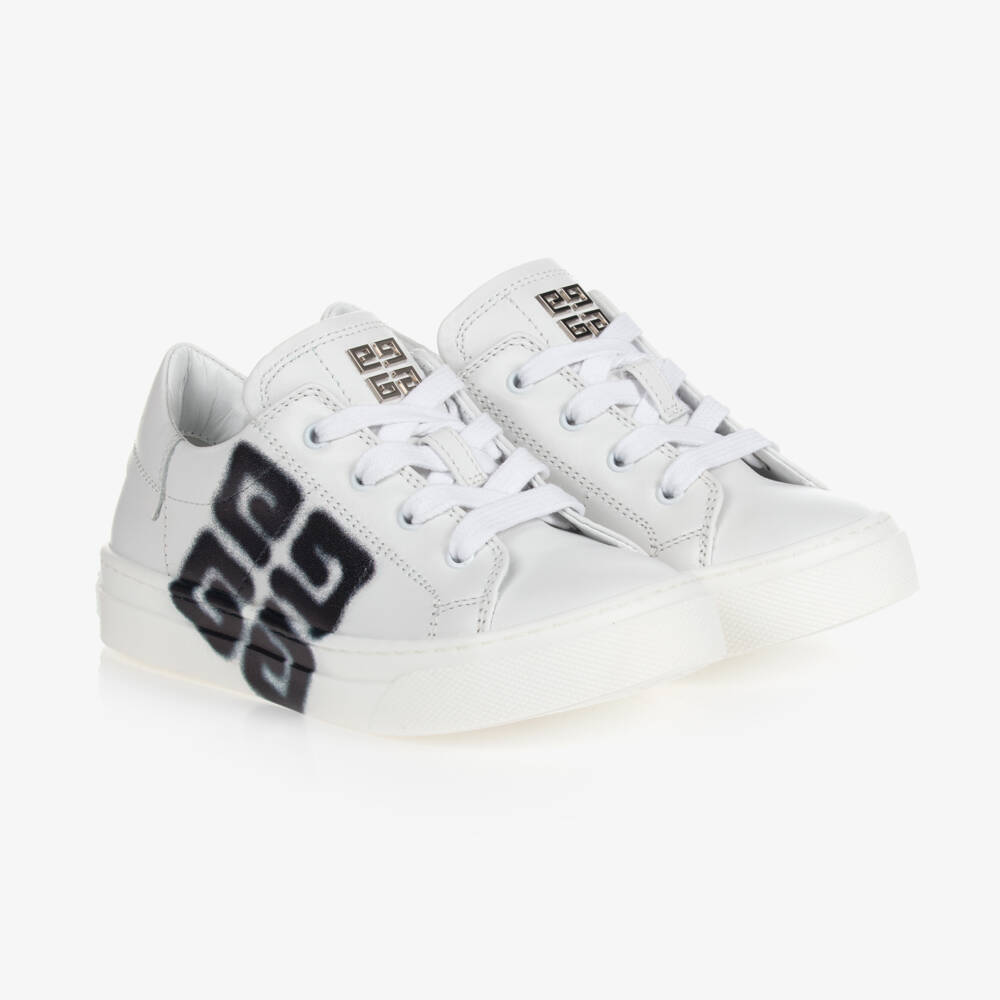 White leather trainers for boys and girls by luxury brand Givenchy. In collaboration with Mexico-based artist Chito, they have graffiti-style 4G logos printed on the side in black. The lining is soft leather for comfort and durability. They have a silver 4G logo on the tongue adding a touch of sparkle and the non-slip rubber outer soles improve grip.