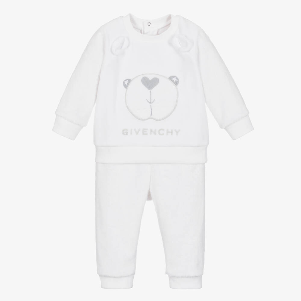 White trousers set for baby boys and girls by luxury brand Givenchy. The velour sweatshirt has a bear embroidered on the front, with a Givenchy logo detailed beneath for a cute designer look. The sleeves are made of cosy faux fur, and there is a signature tonal 4G logo on the matching joggers. Poppers fasten on the back of the top.