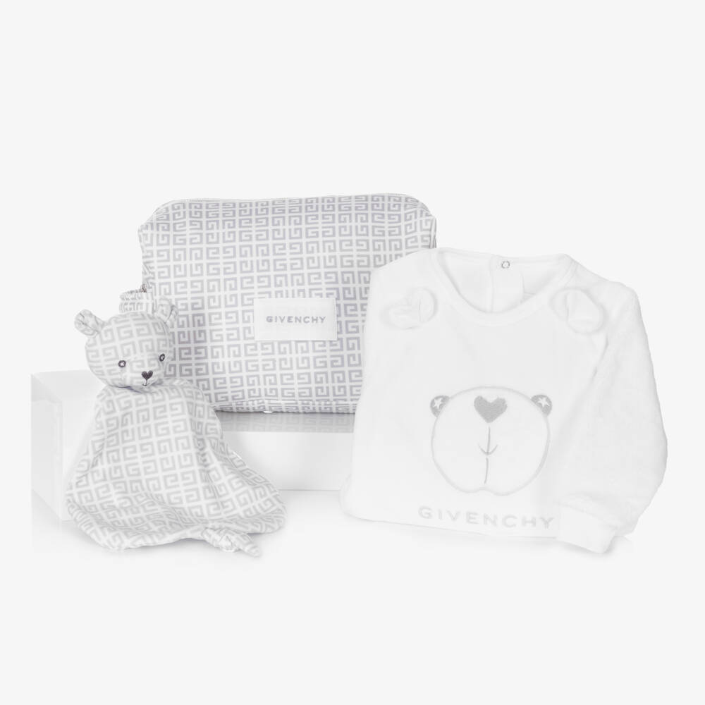 A white and grey babysuit gift set for boys and girls from luxury label Givenchy. Signed with an embroidered logo on the front and branded poppers on the back, the cosy cotton-blend velour babygrow has plush long sleeves, an adorable teddy bear appliqué, and 3D ears below the neckline. The dou dou is made in soft fleece, with a teddy bear motif and knot detail for little hands to explore. Made and lined in cotton, included is a generously sized, padded pouch, great for carrying baby essentials when travelling or for parents as a washbag. It has a useful carry handle, elasticated interior pockets, and an embroidered logo label on one side. An unmistakable pattern from the French brand, both the dou dou and zip-up pouch are enhanced by the famous 4G logo prints.