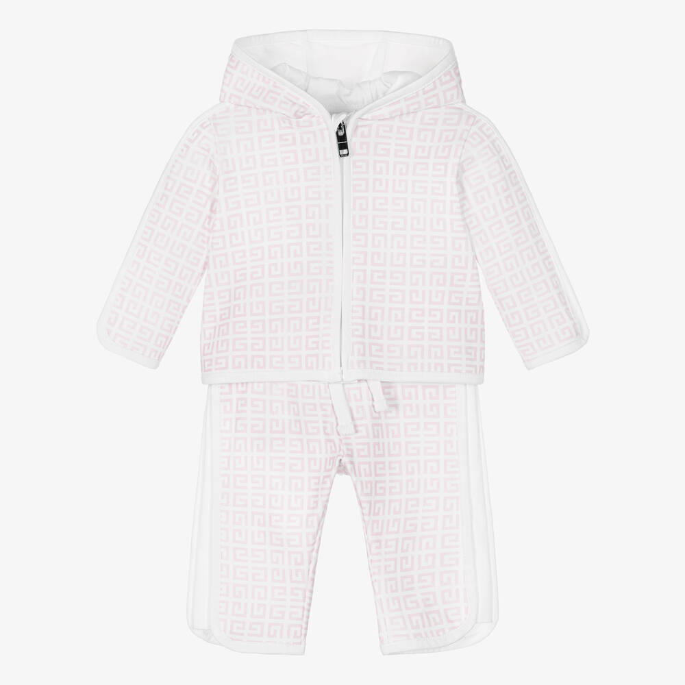 White and pale pink 4G logo print tracksuit for baby girls by luxury brand, Givenchy. This classic two-piece tracksuit is made in beautifully soft interlock jersey. The hooded top is zip-up and the matching joggers have a faux drawstring waistband. Presented in a branded box, it would make a lovely gift.