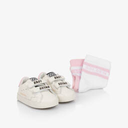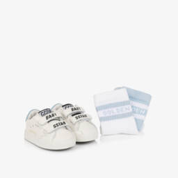 Adorable white pre-walker trainers for baby boys and girls by Italian luxury brand Golden Goose. Beautifully handmade in smooth supple leather, they have playful sporty-themed prints, branded detailing, and the signature star appliqué on one side. The flexible sole ensures comfort, whilst easy-to-use velcro straps provide a secure fit. A navy blue heel tab adds a contrasting pop of colour.