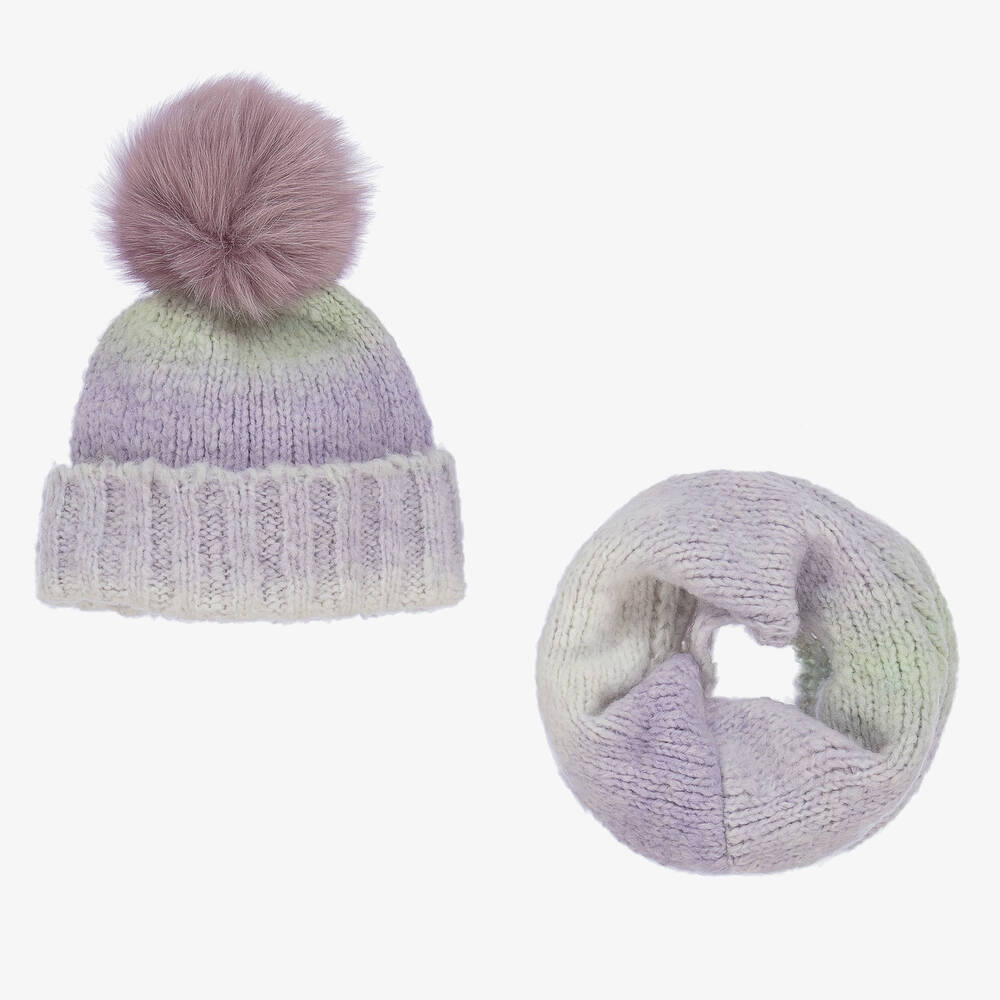 In shades of green and purple, a chunky-knit ombré hat and snood set for girls by Spanish brand Gorros Navarro. Beautifully soft and fluffy, it is knitted in a luxurious blend of wool and alpaca. The hat has a ribbed brim and a gorgeous faux fur pom-pom on top.
