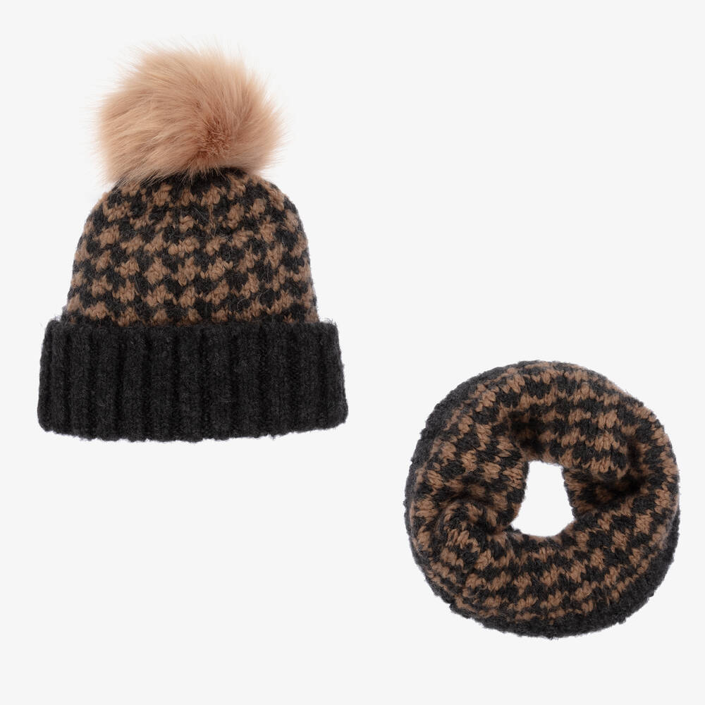 Hat and snood set for girls by Spanish brand Gorros Navarro, knitted in a soft and fluffy wool blend. In a charcoal grey and light brown houndstooth pattern, the cosy hat has a ribbed brim and a faux fur pom-pom on the top. The matching snood keeps the face and neck warm and provides extra insulation in colder temperatures.