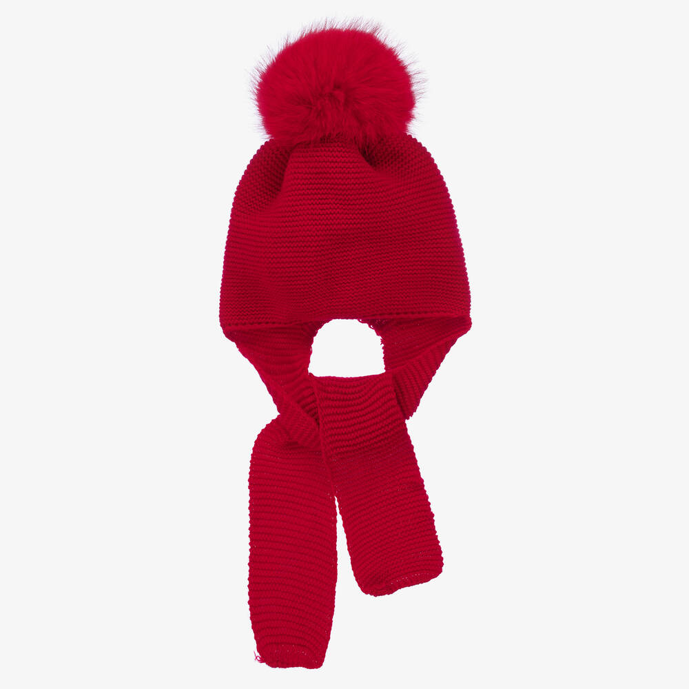 This red hat for baby boys and girls is from Gorros Navarro. Softly knitted, it has an attached scarf to help keep them warm and cosy in the colder months. The removable, popper-fastening pom-pom on the top is made from super-soft faux fur.