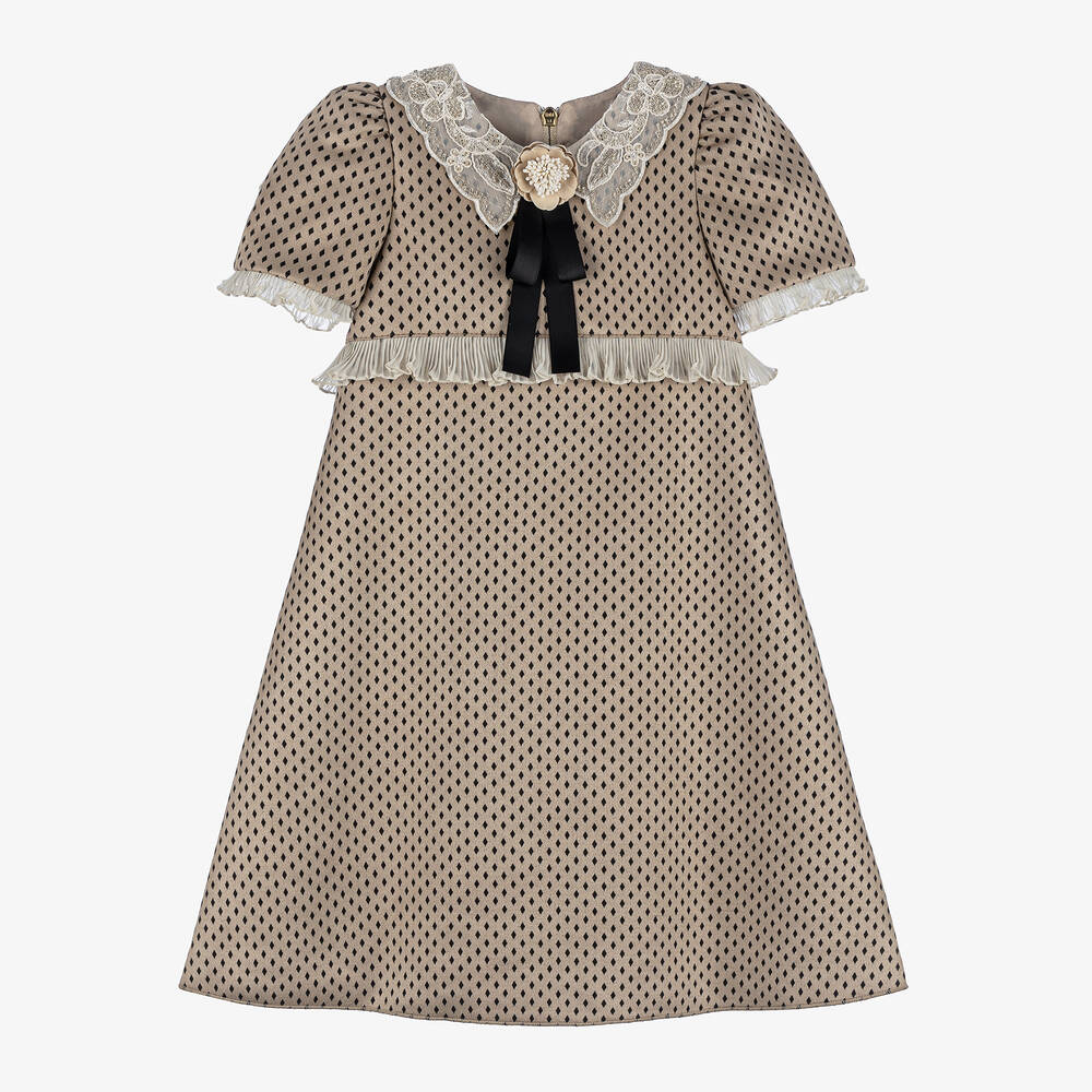 A lovely beige occasion dress for girls by Spanish label Graci, with a black diamond pattern. In an elegant A-line silhouette, this short-sleeved style is made in velvety smooth jersey, with an exquisitely embroidered and beaded ivory tulle collar, and pretty plissé ruffles. A detachable brooch with a beautiful beige flower and black grosgrain ribbons completes the look. This dress has a silky lining on the bodice, a cotton skirt lining with tulle for added flare around the hemline, and an exposed gold zip fastening on the back.