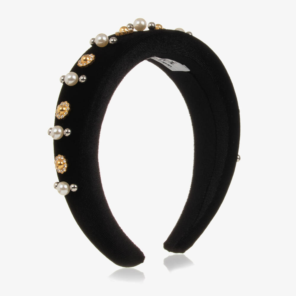 A lovely finishing touch to her special occasion outfit, this elegant black hairband for girls is by Spanish brand Graci. Beautifully handcrafted, the soft padded band is covered in velvety velour and embellished with faux pearls and golden diamanté flowers.