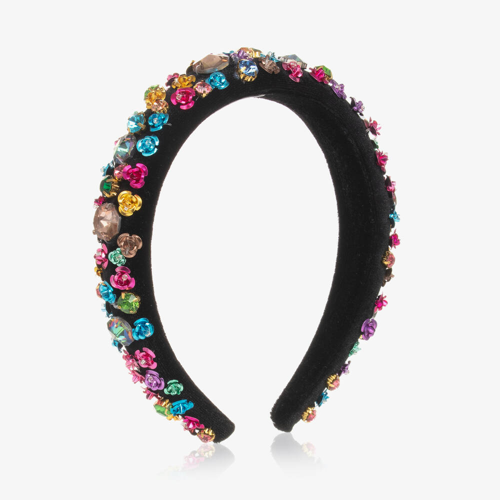 Designed by Spanish brand Graci, a stunning crystal-studded hairband for girls. Beautifully soft and lightly padded, the black velvet band is decorated with beautiful crystals and metal roses in a vibrant array of colours. They are set in gold-tone metal for a striking finish.