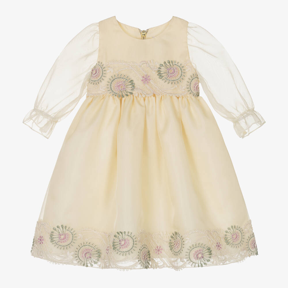 A beautiful special occasion dress for little girls by Graci, in a deep golden shade of ivory with a subtle sheen. The silky smooth organza fabric is embroidered with a green, lilac and ivory floral design on the bodice and hem. Sheer sleeves are elasticated on the cuff and lightly gathered on the shoulder, while an exposed gold zip fastens on the back. The dress has a silky smooth satin underlayer and an additional cotton lining for a gentle feel against the skin. Satin ties fasten into a sweet bow on the back for a charming finish.