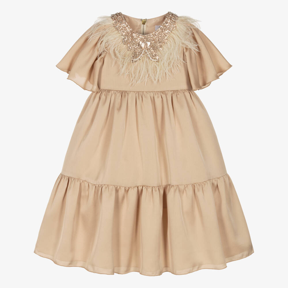 Girls Gold Feather Satin Dress