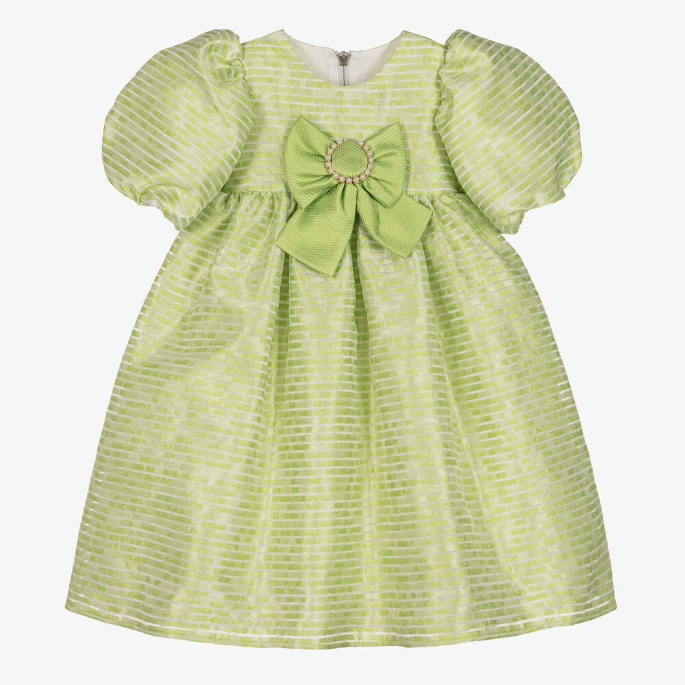 Girls green special occasion dress by Spanish brand Graci, with a gorgeous, detachable bow and pearl brooch on the front. Made in soft and lightweight organza, this pretty dress has a cool cotton lining for added comfort. There are large puff sleeves for a feminine look and a net-trimmed underskirt for added volume.